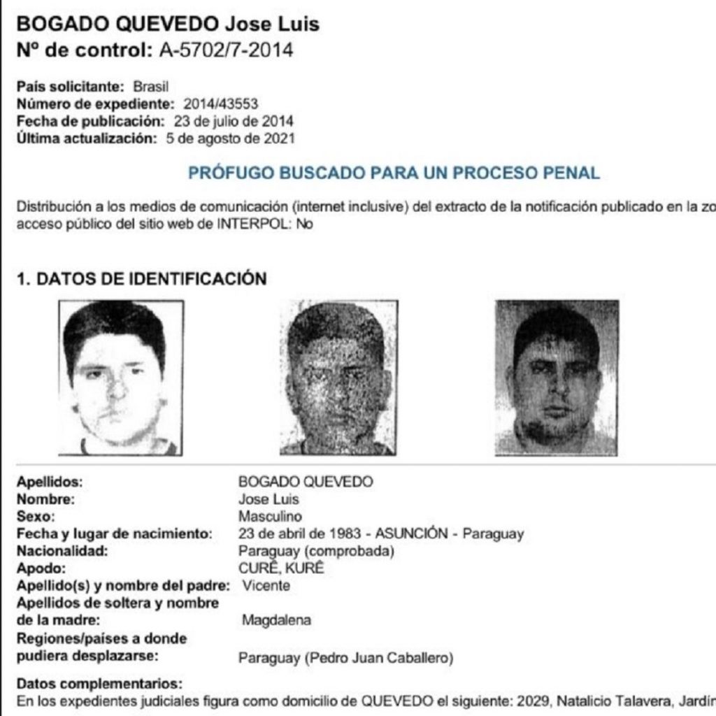 José Luis Bogado Quevedo es uno de los heridos en el tiroteo en el anfiteatro José Asunción Flores de la ciudad de San Bernardino. El mismo cuenta con orden de captura internacional y con pedido de extradición del Brasil. Los fallecidos en el tiroteo son Marcos Ignacio Rojas Mora y la modelo Cristina “Vita” Aranda.