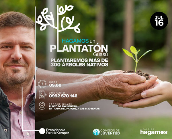 La Comisión de Juventud y la presidencia del Partido Hagamos invitan a toda la ciudadanía a una jornada de plantación de árboles nativos llamada “Hagamos un plantatón Guasu”. Será mañana,